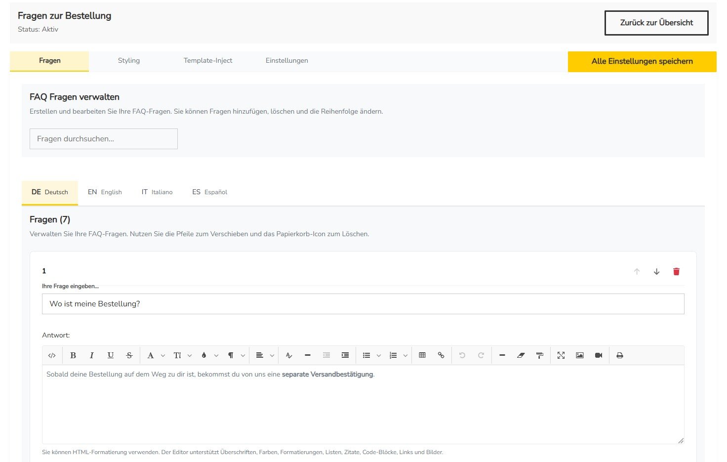 Reduzieren Sie den Aufwand für Ihren Support, indem Sie häufig gestellte Fragen, die immer wieder auftauchen, direkt auf Ihrer Webseite veröffentlichen – und verbessern Sie gleichzeitig Ihre SEO-Rankings. Mit unserem Plugin können Sie auf einfache Weise beliebig viele FAQ-Sets erstellen. Eine benutzerfreundliche Oberfläche sorgt dafür, dass das Erstellen und Bearbeiten der Fragen und Antworten mühelos funktioniert. Dank des leistungsstarken Editors können Sie die Antworten individuell gestalten, indem Sie beispielsweise Zwischenüberschriften, fettgedruckte Textstellen, Tabellen, Bilder oder Links hinzufügen. Um sicherzustellen, dass Ihre FAQs optimal von Suchmaschinen erkannt werden, ergänzen wir diese mit semantischen Markierungen nach bewährten Standards.